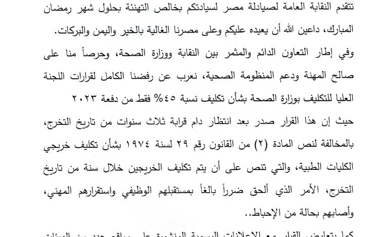 وأكدت النقابة فى خطابها على رفضها الكامل لقرارات اللجنة العليا للتكليف بوزارة الصحة بشأن تكليف نسبة 45% فقط من الصيادلة دفعة 2023، حيث إن هذا القرار صدر بعد انتظار دام قرابة ثلاث سنوات من تاريخ التخرج، بالمخالفة لنص المادة (2) من القانون رقم 29 لسنة 1974 بشأن تكليف خريجي الكليات الطبية، والتي تنص على أن يتم تكليف الخريجين خلال سنة من تاريخ التخرج، الأمر الذي ألحق ضرراً بالغاً بمستقبلهم الوظيفي واستقرارهم المهني، وأصابهم بحالة من الإحباط.